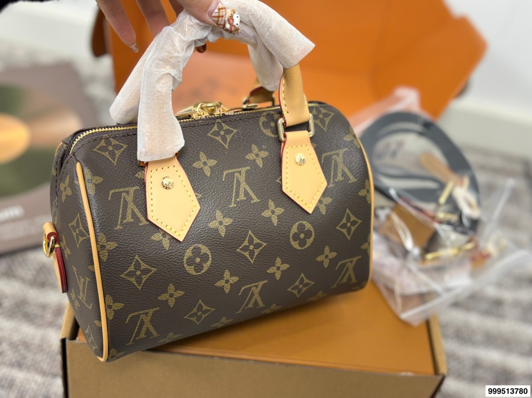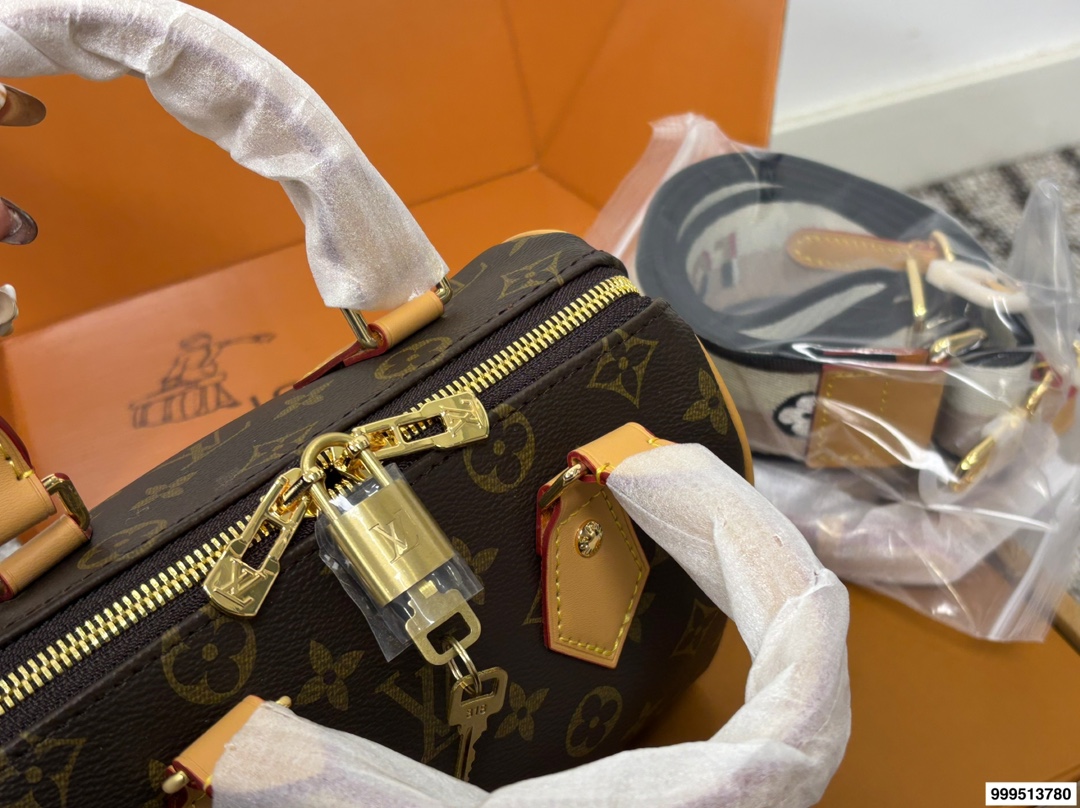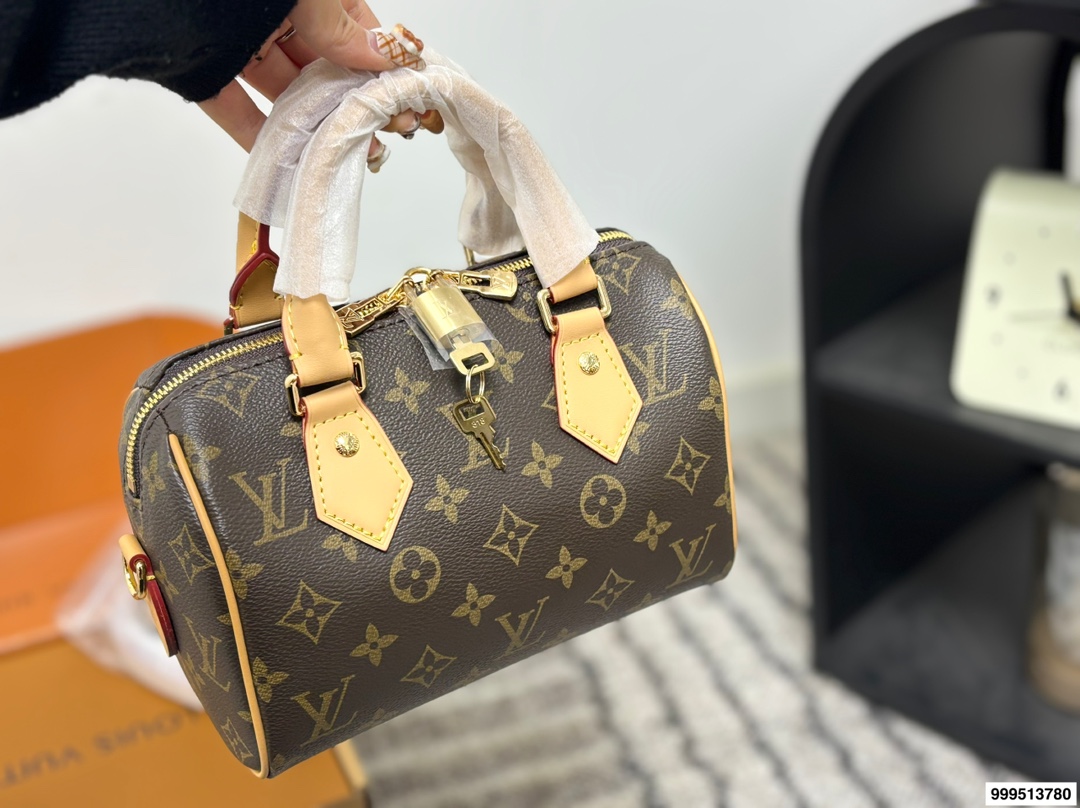 LV Speedy 20 Pillow Bag with Dual Shoulder StrapsThis Retiro handbag is crafted from the iconic LV Monogram fabric, paired with luxurious yellow leather trims, boasting a timeless classic appeal. Its elegant and understated design, combined with a roomy bag body, further enhances its practicality.